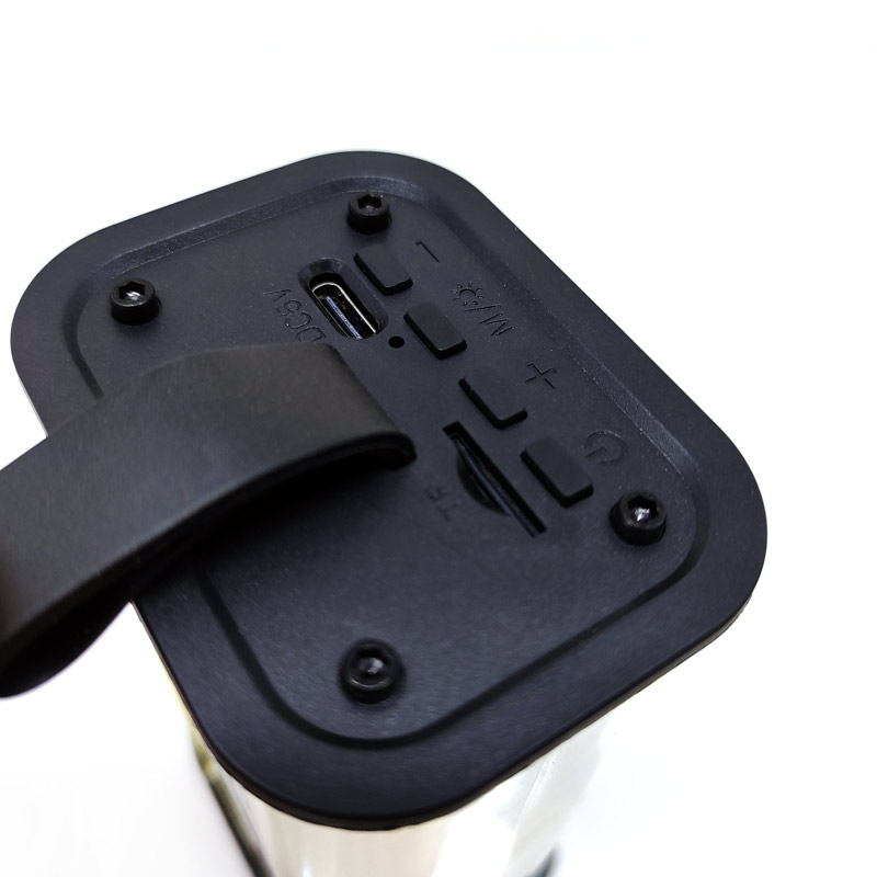 اسپیکر A36 استوانه ای بلندگوی بلوتوثی با باتری قابل شارژ، طراحی شفاف، پنل نور پس زمینه LED چند رنگ و دستهای برای آویزان کردن یا حمل آسان. دارای کلید روشن/خاموش، دکمهای برای تغییر حالت عملکرد و روشنایی، و پورت شارژ USB Type-C. برد اتصال: 10 متر. شامل کابل شارژ USB Type-C.